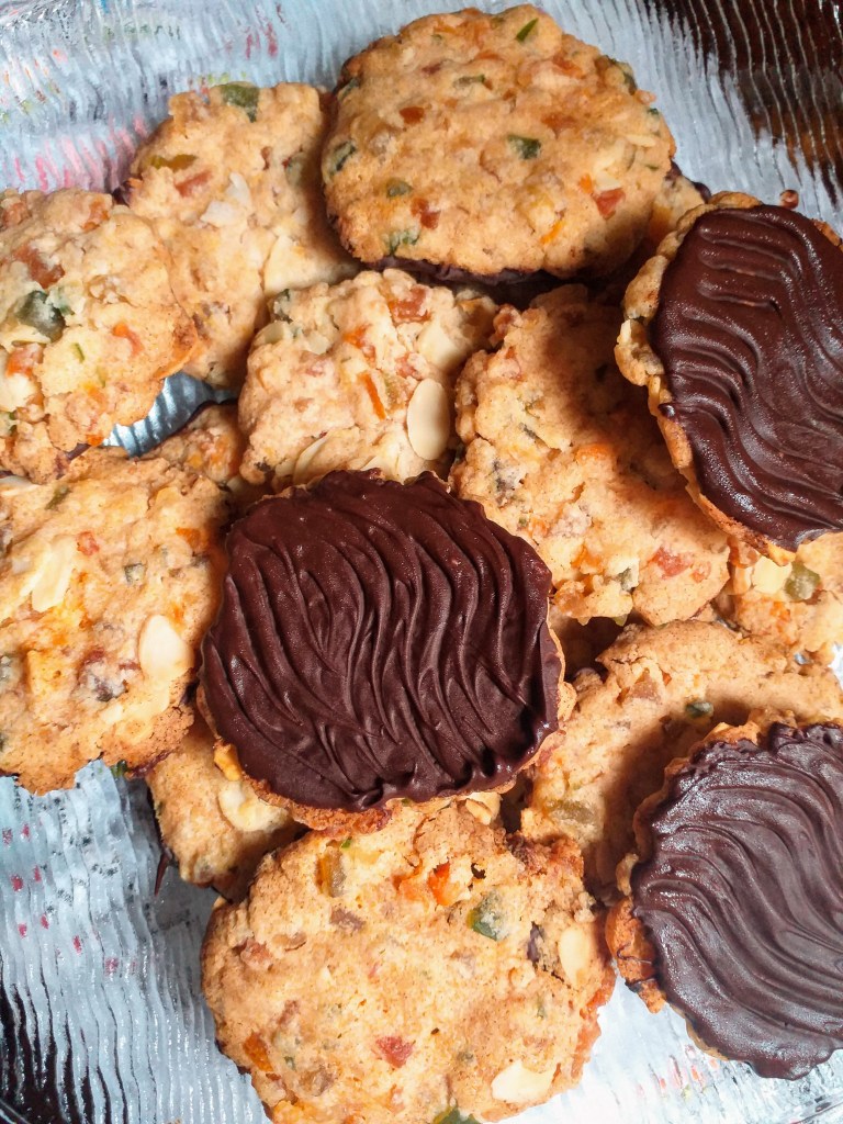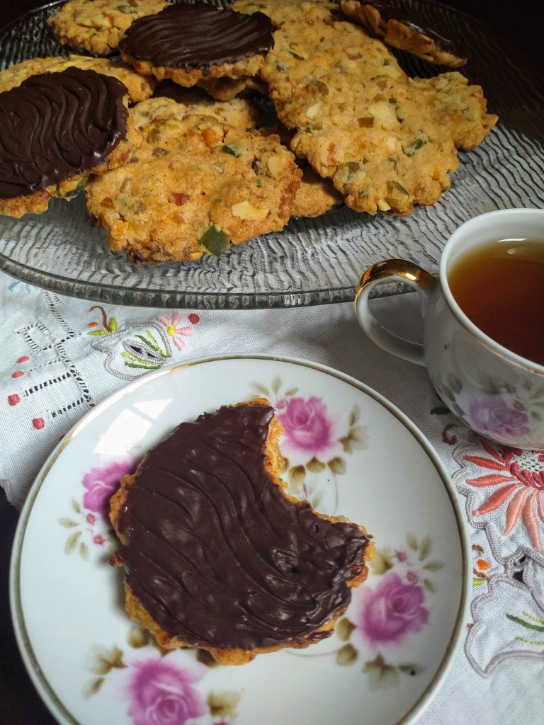 Hoje, olhando a despensa, vi que tinha um pouco de frutas cristalizadas e um pouco de damascos que sobraram do Natal passado… Viraram biscoitos florentinos!