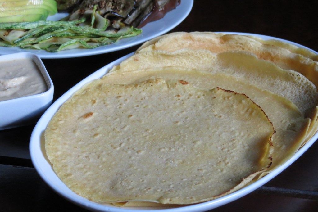 Nessa versão em forma de crepe, a massa fica mais fininha, podendo ser enrolada facilmente, pois é bem flexível, não quebra e não fica ressecada. Você come achando que é uma massa tradicional de panquecas. E não fica gosto de grão de bico, sem interferir em nada no sabor do recheio.