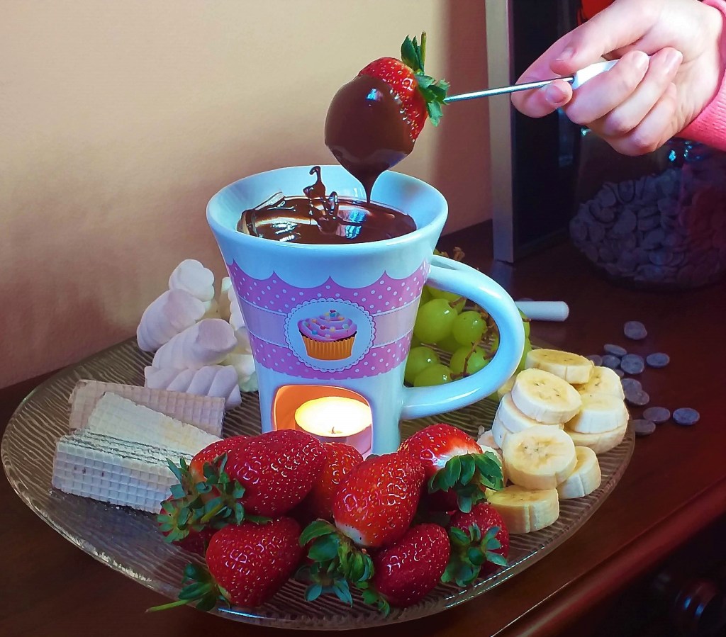 Essa caneca de fondue da foto é muito bonitinha e prática, é só colocar as pastilhas ou o chocolate picado e derreter no microondas, e depois colocar a velinha embaixo pra manter o chocolate aquecido.
