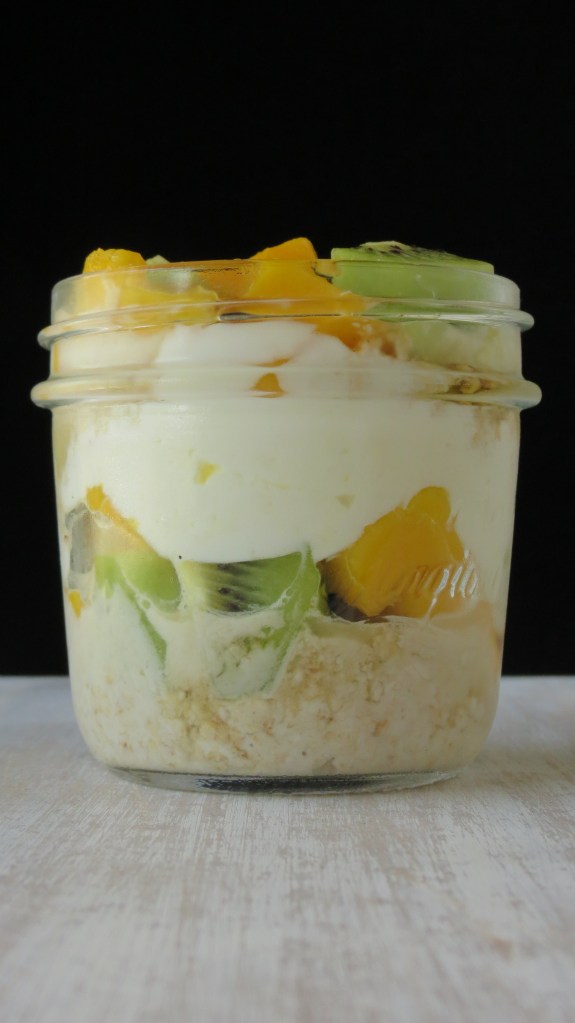 Não tem segredo: uma camada de aveia e leite vegetal, uma camada de fruta, um pouco de iogurte, que é opcional, outra camada de aveia e leite vegetal… Tampe e deixe pernoitar na geladeira.