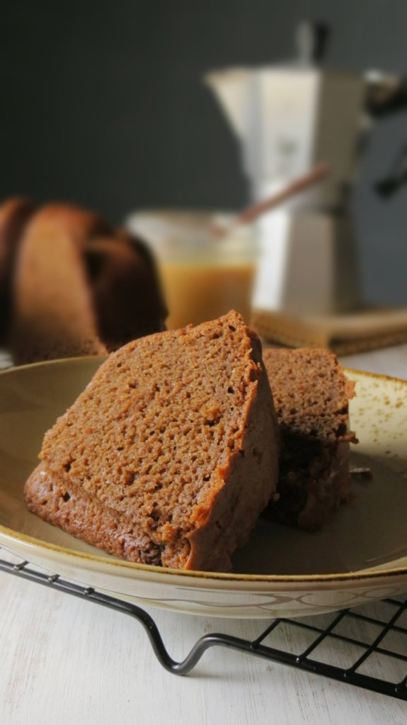 Como você já deve ter adivinhado, é um bolo que vai café na massa. E combinado com o creme de leite vegetal (usei o de aveia) resulta no sabor de capuccino. Eu não coloquei canela na massa, mas dá pra polvilhar depois, no bolo pronto.