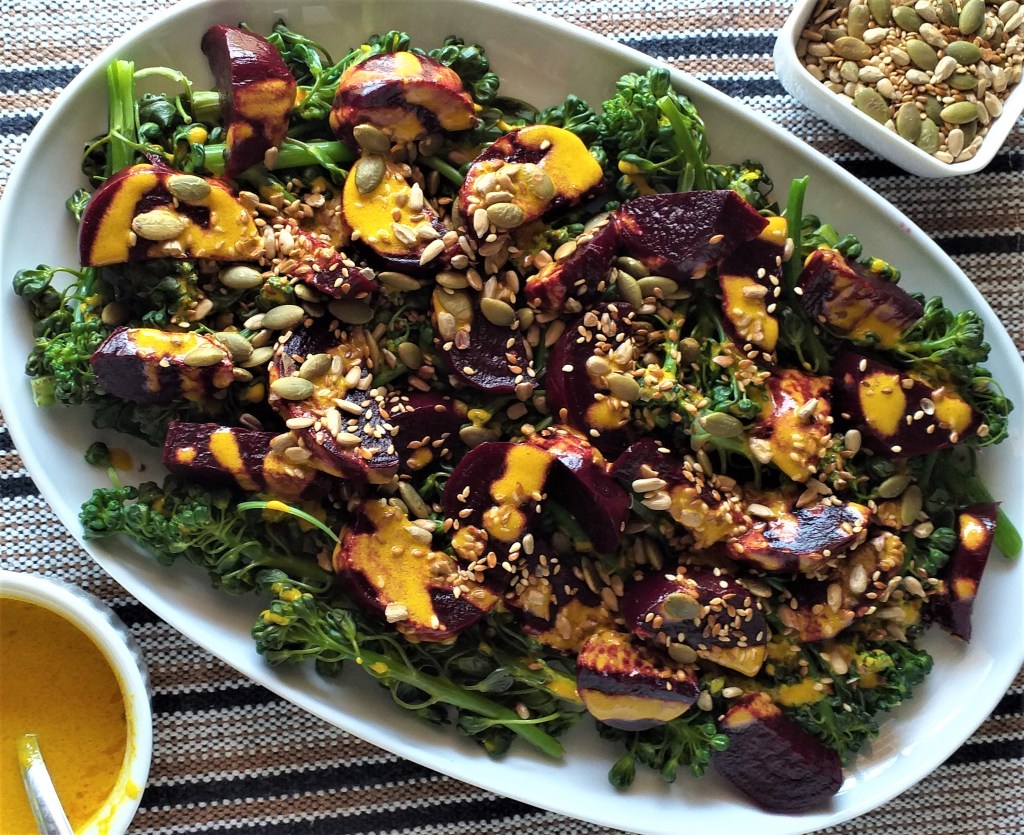 - Monte a salada: Num prato coloque os brócolis, as beterrabas e regue com o molho de tahine** e distribua o mix de sementes por cima.