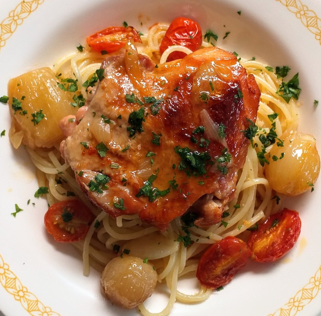 - Quando as sobrecoxas estiverem coradas e as cebolinhas macias, desligue o forno.
