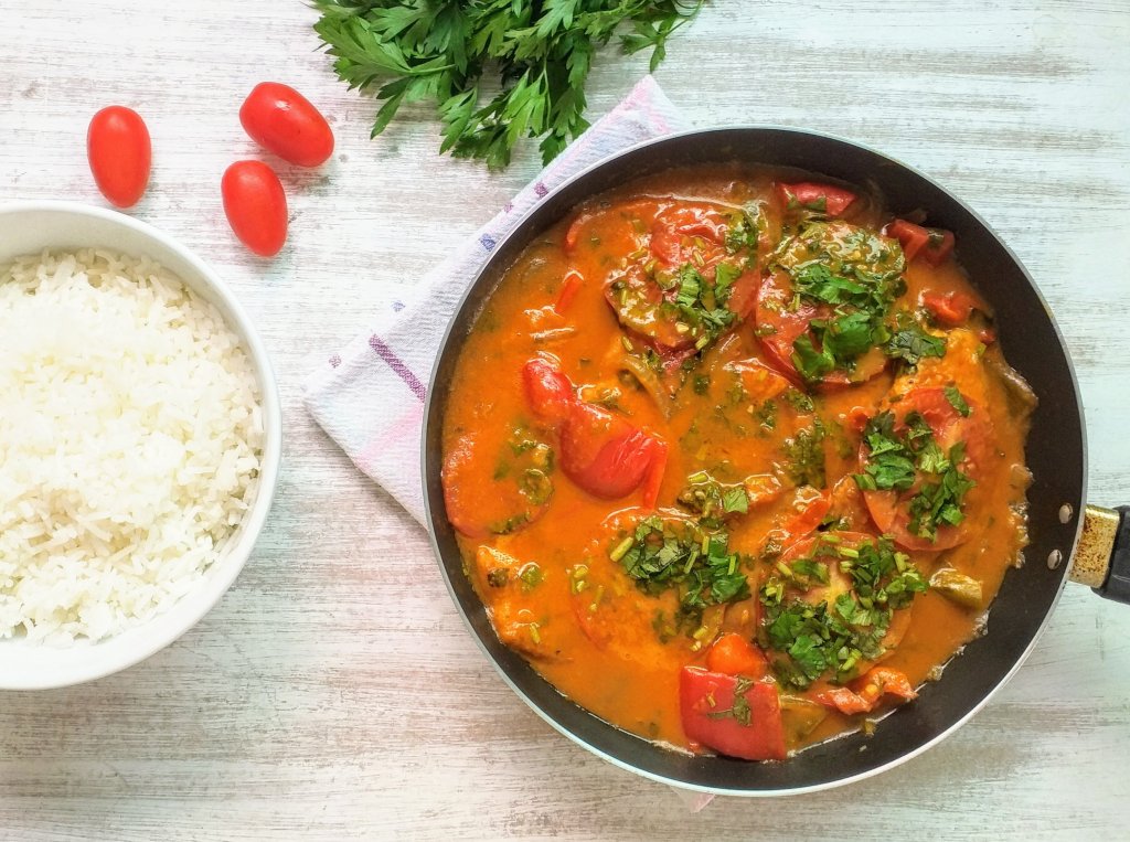 7. Disponha os peixes sobre a cama de vegetais na frigideira, coloque rodelas de tomate maduro em cima dos peixes e despeje o molho por cima.