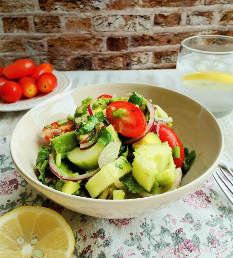 Combinei abacate, pepino, tomatinhos, coentro, azeite, pimenta, lim